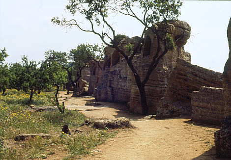 Antike Stadtmauer, die den anstehenden Fels des südlichen Steilabhangs nutzt. In ihr sind christliche Grabstätten (Columbarien) eingetieft.