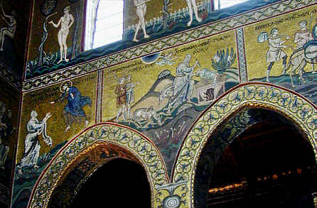 Mittelschiff, Nordwand Darstellungen des Alten Testaments, hier die Erscheinung des Engels bei Jakob (links) und der Opferung Isaaks (rechts).