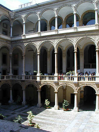 Maqueda-Hof, erbaut unter Vizekönig Maqueda in der Mitte des 16. Jh. Dreistöckige Renaissanceloggia mit römischen Bögen. Die Besuchermenge verdeutlicht den Ansturm der Touristen zur Hochsaison