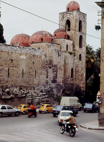 Kubischer Kirchenbau, erbaut unter Roger II. 1132. Der linke Mauerabschnitt ist Überrest der arabischen Moschee, die einen rechteckigen Kubus bildete und an die die Kirche angebaut wurde.