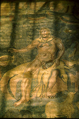 Vestibül des Polyphem Polyphem, mit dem dritten Auge auf der Stirn, in sitzender Haltung, einen geschlachteten Widder auf seinem Schoß.