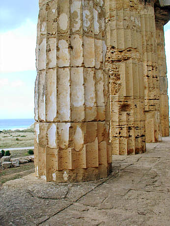 Säulen der Südseite: Putzreste an der vorderen Säule, dahinter Restaurierungen der Neuaufstellung 1957.