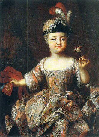 Unbekannter Künstler: Der etwa dreijährige Carl Theodor sitzt bereits in herrschaftlicher Pose, hält in der linken Hand eine Nelke und weist mit der rechten Hand den wittelsbachischen Hubertusorden vor. Der Sitte der Zeit entsprechend trägt er ein Kleidchen, das dem höfischen Schnitt folgt und - wie der Boden der Hurarenkappe - ganz in rosa gehalten ist. Die roten und weißen Federn auf der Kappe verweisen auf rot und weiß als die Farben des Hauses Sulzbach. |
