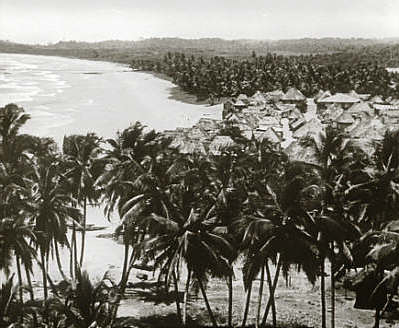 "Blick von der Feste Groß-Friedrichsburg zur Negersiedlung, wo die Negerkönigin residiert, deren Vorfahren sich der Oberhoheit des Großen Kurfürsten unterwarfen" |