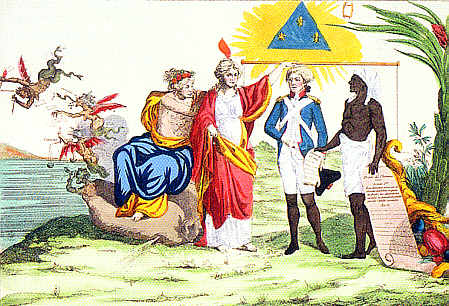 | Die Vernunft, von der Flamme der Vaterlandsliebe (blaues Dreieck) erleuchtet, hält die Messlatte der Gleichkeit über einen Weißen und einen Farbigen. Dieser hält in der einen Hand die Erklärung der Menschen- und Bürgerrechte, in der anderen das Dekret vom 15. Mai 1791, mit dem die Bürgrerrechte auch den Farbigen zuerkannt wurden. Füllhorn, Bananenstaude und fruchtbare Felder symbolisieren die Aussicht auf Reichtum und Wohlstand. Links im Bild fliehen die Dämonen der Aristokratie, der Ungerechtigkeit und des Egoismus übers Meer. | |