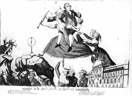 Familie. Marie Antoinette wird als die Urheberin des Fluchtplans dargestellt, sie trägt den König und den Dauphin auf ihrem Rock und hält ihre Tochter und ihrer Schwägerin an der Hand, um sie ebenfalls mitzunehmen. Die Frau unter der Königin hält ein Halsband als Anspielung auf die Affären der Königin hoch, Abgeordenten der Nationalversammlung wird eine Mitschuld zugeschrieben, da sie den mont midi (=Montmédy) stützen. Links im Bild die Emigranten, die die Königsfamilie bereits erwarten. |