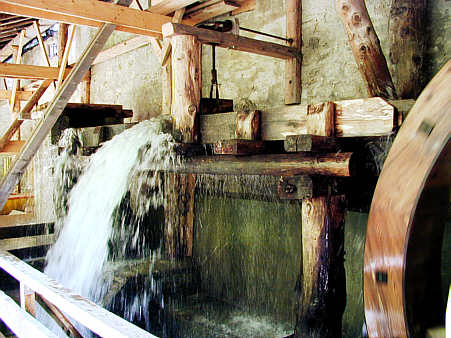 Oberschlächtiges Mühlrad. Im Bild die Absperrung des Wasserzulaufs auf das Mühlrad. Das überschüssige Wasser fließt seitlich aus der Rinne.