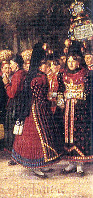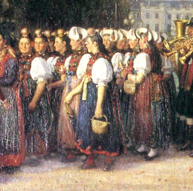 | Andererseits hatte dieser Rückgriff auf die traditionellen Trachten natürlich auch eine gesellschaftspolitische Funktion. Trachten standen hier für die gute alte Zeit", die mehr Ordnung im Land verhieß als die unübersichtliche Welt der Industriegesellschaft. Von daher erklärt sich die Vorliebe des Fürstenhauses für die malerische Gutacher Tracht, die durch diese Protektion schnell zur scheinbar typischen" Schwarzwäler Tracht wurde. | |||||||||