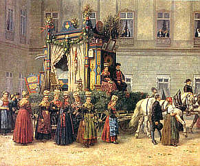 Der dritte Wagen war wie eine Kapelle gebaut, und das Goldene Hochzeitspaar saß davor, von Kindern und Enkeln umgeben. |
