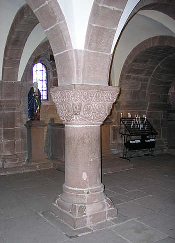 Eine kräftige Mittelsäule mit skulptiertem Würfelkapitell trägt das Kreuzgewölbe des beinahe quadratischen Raums.