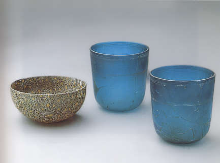 2 Glasbecher und eine Millefioriglasschale aus dem frührömischen Legionslager von Dangstetten (BW)
