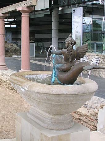 Zierbecken im Peristyl, Detail: auf einem Delfin reitender Putto als Springbrunnen (Rekostruktion)
