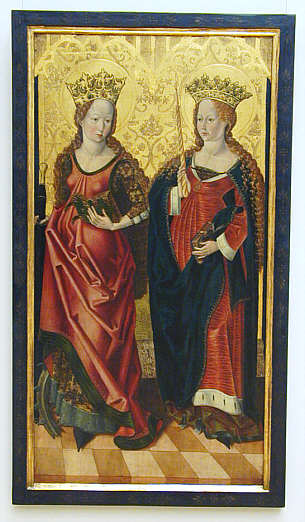 Meister der Benda-Madonna, Oberrhein, um 1490/1500 Katharina und Genoveva Die beiden Heiligen stehen vor gemusterten goldenen Vorhängen auf farbig abgesetztem Kachelboden und sind mit ihren Attributen gekennzeichnet: Katharina mit Rad und Buch, Genoveva mit der geflochtenen Kerze, die ihr ein Engel bei einem nächtlichen Messbesuch enbtzündet haben soll. |