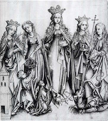 Federzeichnung in Schwarz, 2. Hälfte 15. Jahrhundert In der Bildmitte leicht überhöht die Heilige Katharina mit Buch und Rad, links neben ihr Dorothea mit dem Blumenkranz und Barbara mit Palmenzweig und Turm, rechts neben ihr Ursula mit dem Pfeil und Margarete mit dem Kreuzstab und dem Drachen zu ihren Füßen. |
