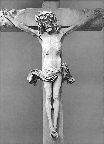 Kruzifixus Sandstein, Straßburg, 1467 Gekreuzigter Christus an einem aus starken Stämmen gezimmerten Kreuz, die Züge der erlittenen körperlichen Leiden sind realitätsnah nachgezeichnet, aber auf das Äußerste reduziert. Im Gesicht werden die Spuren der erlittenen Pein durch den errungenen göttlichen Frieden besänftigt und ausgeglichen. |