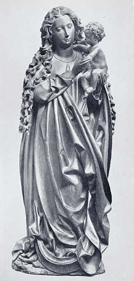 Stehende Maria mit Kind um 1470 Die schwingenden Röhrenfalten des reich fließenden Gewandes und die schwer gewundenen Haarstränge, die Gesicht und Hals rahmen, sprechen für eine gewisse Distanz vom Werk Niclaus Gerhaerts. Das Kind ist dem Gesicht der Mutter nah, ihr Blick dem Kind fest zugewandt. Die schwer herabfallenden Mantelzipfel umkleiden die Mondsichel, auf der die Jungfrau steht. |