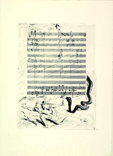 Max Slevogt, Die Zauberflöte, Randzeichnungen zu Mozarts Handschrift, Illustrationen zur Originalpartitur in Faksimile, nach den Radierungen gedruckt bei Otto Feising, verlegt bei Paul Cassirer, Berlin 1920 (Heidelberg, Kurpfälzisches Mus.): "Zu Hilfe, zu Hilfe, sonst bin ich verloren" (I, 1)