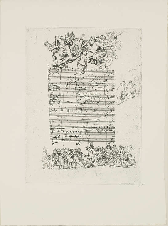 Max Slevogt, Die Zauberflöte, Randzeichnungen zu Mozarts Handschrift, Illustrationen zur Originalpartitur in Faksimile, nach den Radierungen gedruckt bei Otto Feising, verlegt bei Paul Cassirer, Berlin 1920 (Heidelberg, Kurpfälzisches Mus.): "Erst ein kleiner Papageno" (II, 29)