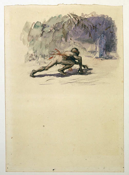 Max Slevogt, Elf Einfälle zur Zauberflöte, Aquarelle, um 1917 (Mannheim, Kunsthalle): Monostatos belauscht den Mordplan der Königin mit Pamina
