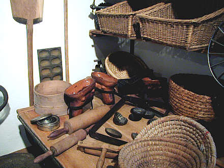 Die Bäckerei Körbe als Teigform für Brote, daneben tönerne Backformen für Osterlämmer