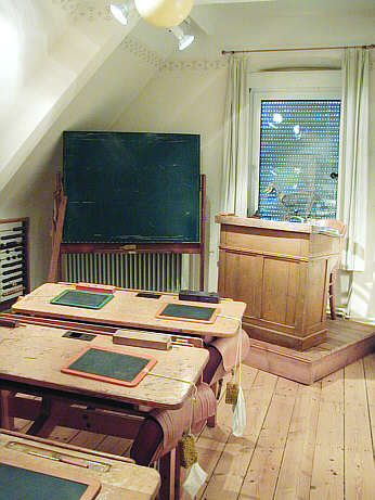 Der Schulraum Fest installierte Tische und Bänke mit hochklappbaren Tischplatten. Hinten Gestelltafel und Lehrerpult ("Katheder") |