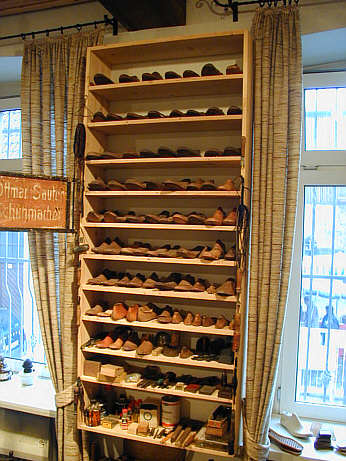 Die Schuhmacherei Regal mit den passgenau gefertigten Leisten der Kundschaft |