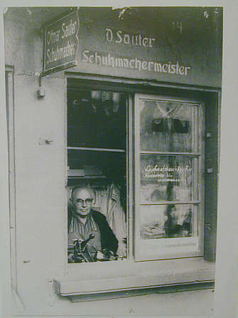 Die Schuhmacherei Ottmar Sauter am Fenster seines Geschäfts |