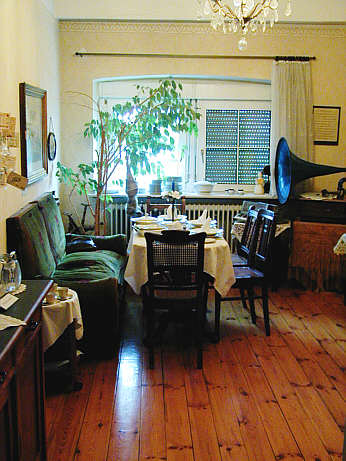 Die Stube Dielenboden, Esstisch mit Stühlen, Sofa, im Hintergrund ein Grammophon |