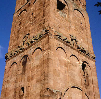 Süd- und Westseite des romanischen Turms mit Tier- und Menschengestalten.