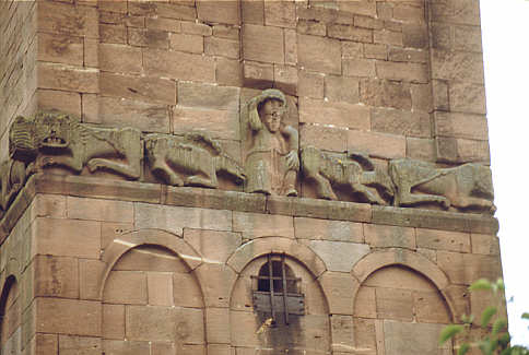 Skulpturenfries: Wächterfigur zwischen Widdern (innen) und Löwen (außen)