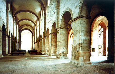 Das Gewölbesystem beginnt erst in Kämpferhöhe der Pfeiler. Die rechteckigen Vorlagen sitzen, wie oft bei den Zisterziensern, auf Konsolen und bestätigen die Schlichtheit der Architektur. Gurtbögen mit Recht- eckprofil setzen sie in die Gewölbezone fort. |