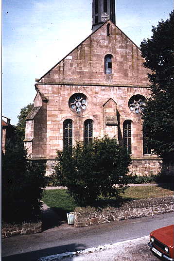 Herrenrefektorium im Zisterzienserkloster Schönau, AußenansichtVon außen zeigt sich das Herrenrefektorium als typisch schmuckloser Bau der Spätromanik, ganz in der architektonischen Askese der Zisterzienser gehalten. Von ganz ähnlicher Raumwirkung ist das Herrenrefektorium des ehemaligen Klosters Maulbronn. |