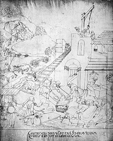 ora et laboraDas Gebot der Zisterzienserregel, zu beten und zu arbeitenDie praktische Handarbeit war Bestandteil der zisterziensischen Ordnung. In dieser Handschrift aus dem 15. Jahrhundert werden die Mönche des Klosters Schönau dargestellt, wie sie mit eigener Hand an ihrer Klosterkirche bauen. Auch das Stifterbild aus dem Kloster Maulbronn zeigt die Mönche beim Bau ihrer eigenen Kirche. Im burgundischen Kloster Fontenay ist die Schmiede als Arbeitsplatz der Zisterzienser noch erhalten. |
