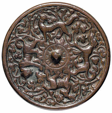 Gezeigt ist die Rückseite, deren Reliefdekor mitgegossen wurde, mit Darstellung eines Onagers, Salugis, Fuchses und Löwen vor Dreiblattranken.