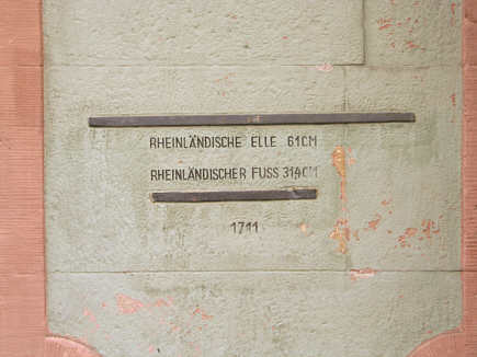 In der Stadt Mannheim gebräuchliche Standardmaße, am Alten Rathaus in Bronze in die Mauer eingelassen: Rheinländische Elle 61 cm Rheinländischer Fuß 31,4 cm 1711