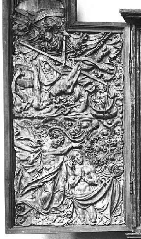 NiederrotweilSchnitzaltar im Chor der KircheHochaltar der St. Michaels-Kirche, ein Werk des Meisters HL, um 1525 Der linke Flügel zeigt als Holzschnitz-Relief die Seelenwägung am Tag des Jüngsten Gerichts (oben) und die Taufe Christi (unten) |