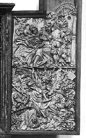 NiederrotweilSchnitzaltar im Chor der KircheHochaltar der St. Michaels-Kirche, ein Werk des Meisters HL, um 1525 Der rechte Flügel zeigt als Holzschnitz-Relief die Enthauptung Johannes des Täufers (oben) und den Engelssturz (unten). |