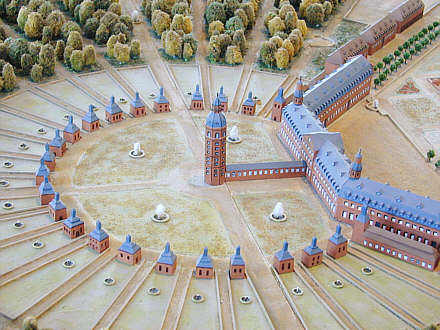 Schlossturm als Mittelpunkt der Anlage und umgebende Zirkelpavillons. Zustand vor dem Umbau 1752