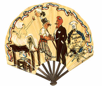 Um 1900 wurde die künstlerische Gestaltung dieser Fächer oft von bekannten Malern und Graphikern wie Léandre, Redon, Willette oder Cassandre ausgeführt. Stilistische Entwicklungen vom Historismus über den Jugendstil zur Art Deco lassen sich an den Werbefächern ablesen, zu denen teilweise identische oder ähnliche Plakatentwürfe nach-weisbar sind. In den Bildmotiven findet der Betrachter neben den Produkten - die prä-genden gesellschaftlichen Themen der Entstehungszeit wieder. So wird für ein Parfum mit einer allegorischen Darstellung der jungen französischen Republik geworben und ein Harlekin aus der italienischen Comedia dellArte verführt zum Genuss eines Aperitifs. Renommierte Pariser Manufakturen wie Chambrelent oder Duvelleroy produzierten neben Luxusfächern auch die einfacheren Werbefächer. In Heimarbeit wurden von Frauen und Kindern die bedruckten Papier-Fächerblätter auf Holzgestelle geklebt und mit den wei-teren Einzelteilen zum Endprodukt zusammengefügt. Zur Ausstellung ist ein Katalog zum Preis von 23,- DM erhältlich. |