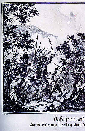 Stereotype, nicht authentische Darstellung des Gefechts zwischen den badischen Revolutionstruppen und der preußischen Interventionsarmee am 29. Juni 1849. Zugunsten einer schnellen Verbreitung wurde auf originalgetreue Darstellung des Schauplatzes verzichtet. Bad. Landesmuseum Karlsruhe, Kat. Nr. 72 |