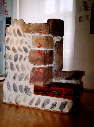 Rekonstruktion eines Türgewändes aus Freiburg mit im Fischgratmuster verlegten Flusskieseln und Gewände aus bearbeitetem Sandstein.