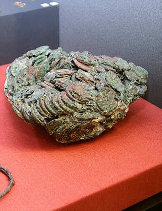 Klumpen aus verbackenen Silber- und Bronzemünzen, in einem Korb aus geflochtenen Weidenruten zusammengepackt.