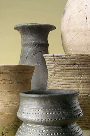 Keltische Flasche (Vordergrund), römische Amphoren (Hintergrund)