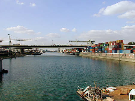 Rechts der Containerumschlag, in der Bildmitte die Überführung der Kurt-Schumacher-Brücke über den Hafen |