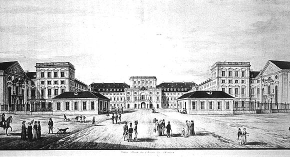 Der Stich vom Angang des 19. Jahrhunderts zeigt das Schloß mit seinen originalen Dächern, die nach 1945 wesentlich flacher wiederhergestellt wurden, und mit den Schloßwachhäuschen, die Anfang der 60er Jahre dem Verkehr weichen mußten. Zentrum des Ehrenhofes bildet das Haupttreppenhaus mit dem Rittersaal, er wird flankiert von der ehemaligen Schlossbibliothek und der Schlosskirche. |
