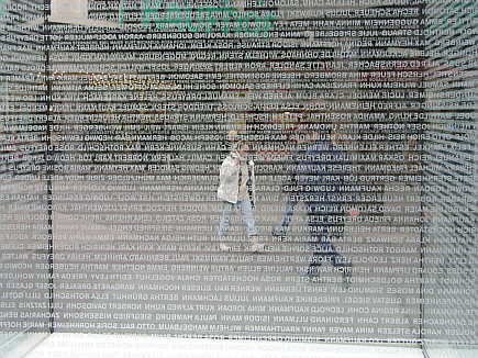Die Namen der jüdischen Bürger der Stadt sind spiegelverkehrt in das Glas des Kubus eingraviert.