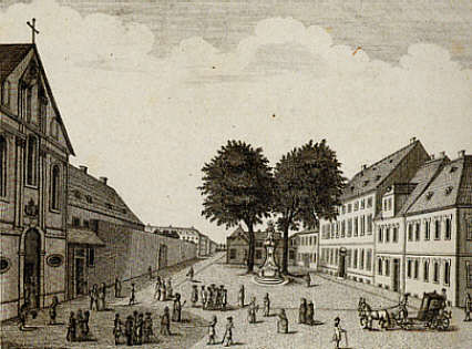 Die Kapuzinerkirche Im Bild der Kapuzinerplatz (heute Gockelsmarkt) mit einer Johannes-von-Nepomuk-Statue von Paul Egell. Links am Bildrand die Fassade der Karmeliterkirche (1703 - 06 erbaut, 1839/40 abgebrochen). |