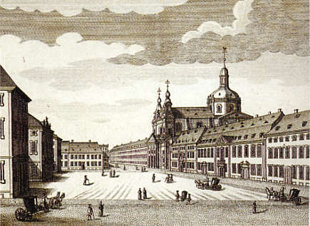 Platz vor dem Komödienhaus Blick über den freien Platz vor dem Nationaltheater auf Jesuitenkirche und Jesuitenkolleg. Rechts am Bildrand mit dem Giebel das Palais Zweibrücken (erbaut 1730 für den Freiherrn von Dalberg, 1790 im Besitz des Pfalzgrafen Max Joseph von Zweibrücken) |