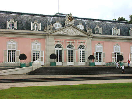 Vorderfront mit dreiachsigem Giebelrisalit. Der Fassadenaufriss suggeriert ein zurückhaltendes zweistöckiges Gebäude, dessen hohe Parterrefenster jedoch das erste Obergeschoss überschneiden.