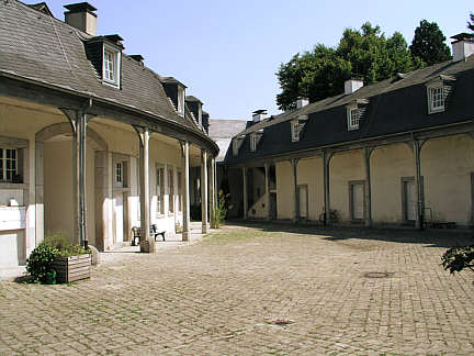 Innenhof: rechts der gerade geführte Schenkel zum Park hin, links der gebogene Flügel zum Teich, in der Ecke jeweils eine Stiege